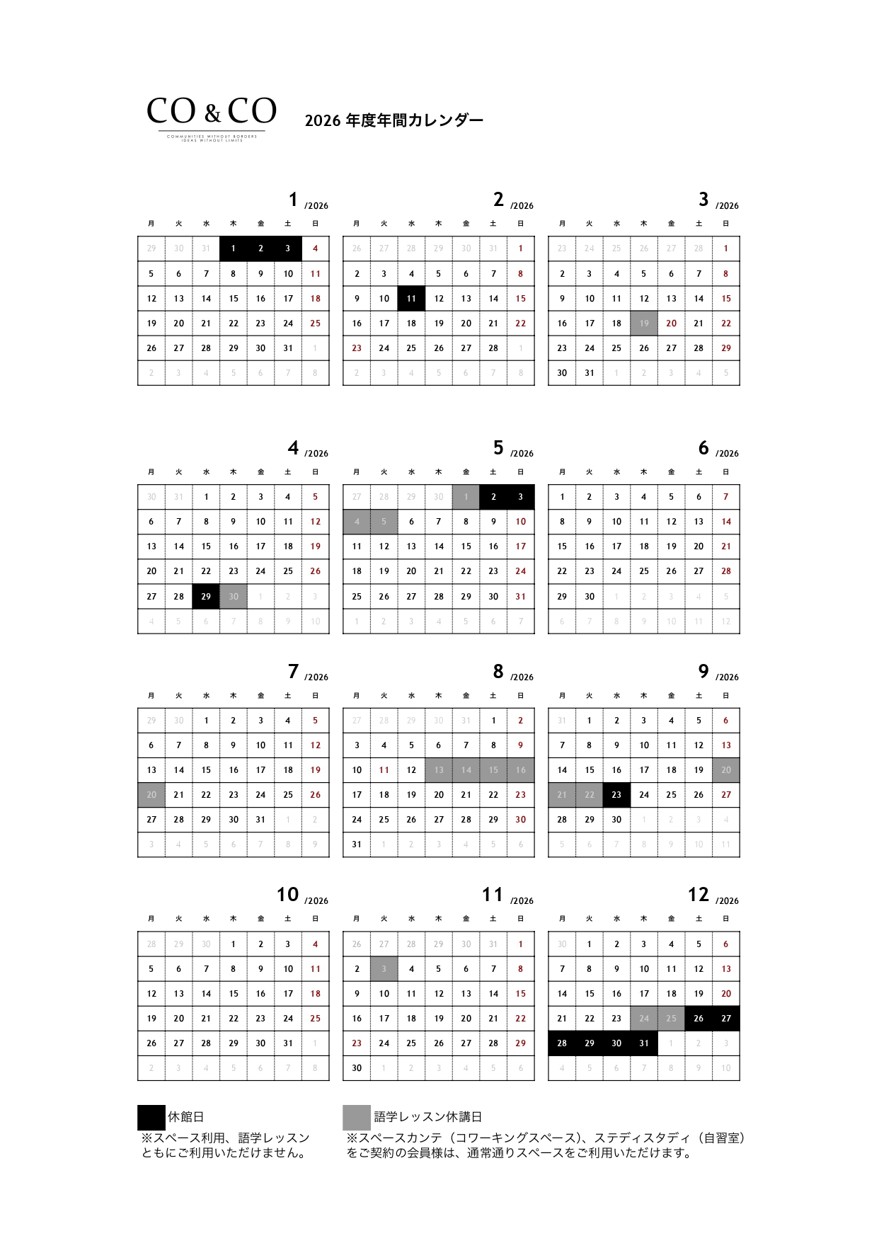 ランゲージハウスアジア京都の2026年営業日は、こちらでご確認頂けます。